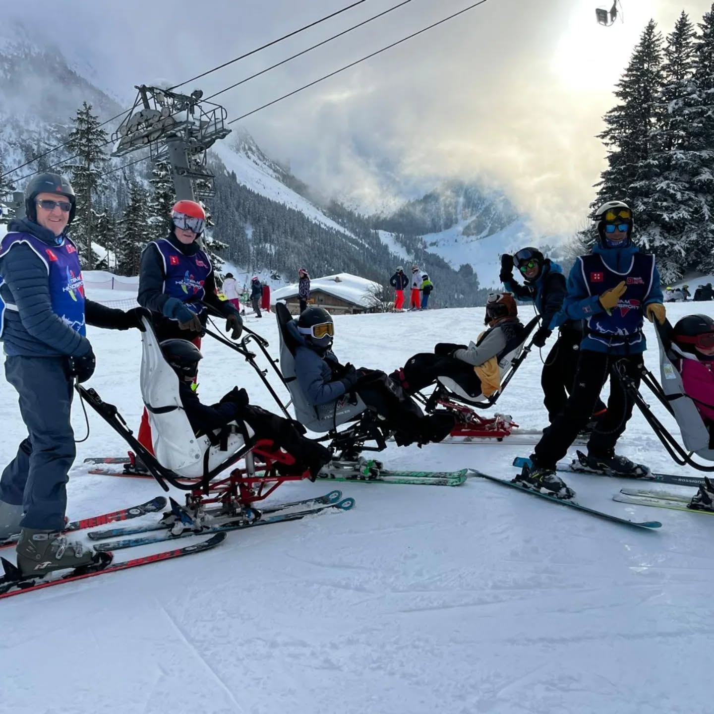 Stage de 2 jours à Combloux pour 5 jeunes en situation de handicap physiques, avec découverte/progression en uniski, snowkart, tétraski et tandem.