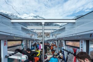 Sur le funiculaire de Bourg‑Saint‑Maurice – Les Arcs en Savoie, la même démarche a guidé la création d’un toit vitré pensé comme un belvédère sur les montagnes, issu d’une immersion in situ et d’un travail sur la vision panoramique plus que sur le « geste » formel. L’atelier Patrick Jouffret l’a redessiné en repartant d’un constat simple : « le spectacle, ce sont les montagnes, au-dessus et derrière les voyageurs ! ». Toit vitré, volumes inspirés des belvédères de Charlotte Perriand libèrent les vues et l’espace, transformant un transport contraint en véritable voyage immersif au cœur du paysage. Le poste de conduite, la modularité intérieure (assises, espaces vélos) et l’usage du verre sont conçus comme un projet de design global, où l’expérience utilisateur, la circulation à bord et la durabilité du produit priment sur le style.